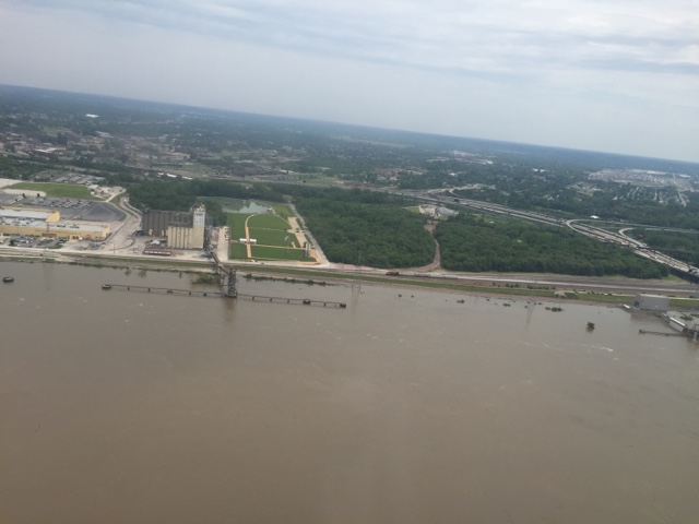 The Mississippi River is flooded over its banks and taken over part of the Riverfront.